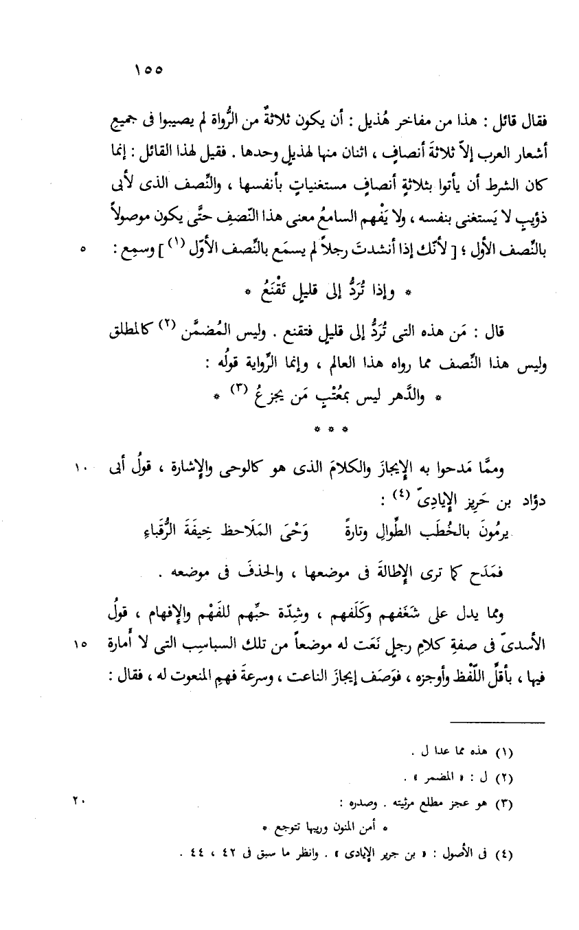 فقال قائل هذا من مفاخر هذيل ان يكون ثلاثة من الرواة لم يصيبوا في جميع أشعار العرب إلا ثلاثة أنصاف إثنان منها لهذيل وحدها فقيل لهذا القائل إنما كان الشرط ان يأتوا بثلاثة أنصاف مستغنيات بأنفسها والنصف الذي لأبي ذؤيب لا يستغني بنفسه ولا يفهم السامع معنى هذا النصف حتى يكون موصولا بالنصف الاول لانك إذا أنشدت رجلا لم يسمع بالنصف الاول