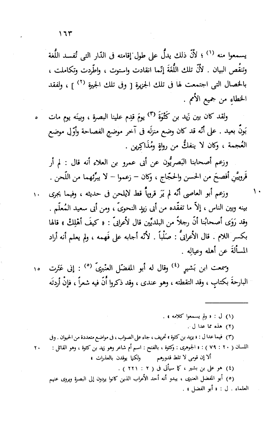 وزعم أصحابنا البصريون عن ابي عمرو بن العلاء انه قال لم أر قرويين أفصح من الحسن والحجاج وكان ما زعموا لا يبرئهما من اللحن وزعم أبو العاصي انه لم ير قرويا قط لا يلحن في حديثه وفيما يجري بينه وبين الناس إلا ما تفقده من أبي زيد النحوي ومن ابي سعيد المعلم