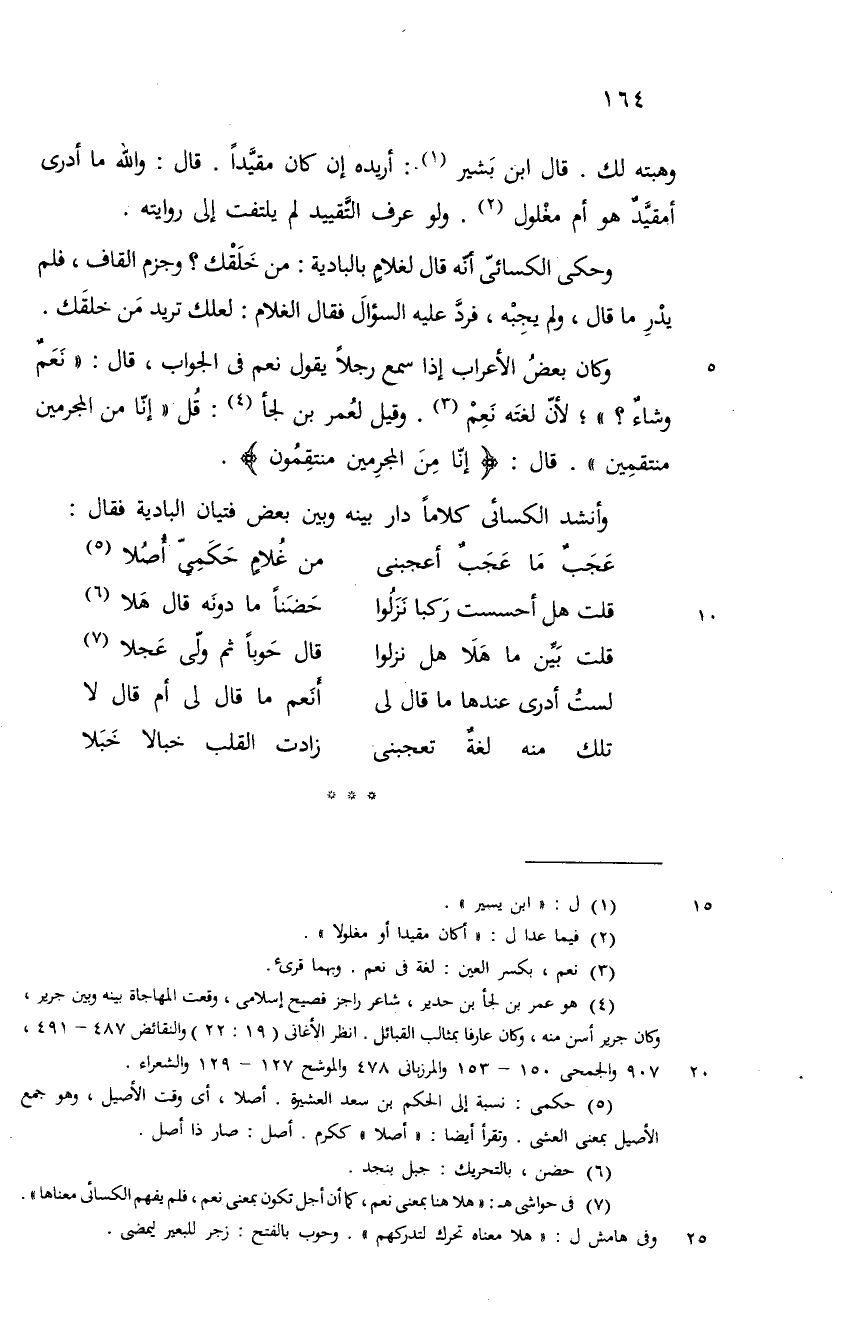 ولم يجبه فرد عليه السؤال فقال الغلام لعلك تريد من خلقك وكان بعض الاعراب اذا سمع رجلا يقول نعم في الجواب قال نعم وشاء لان لغته نعم وقيل لعمر بن لجاء قل إنا من المجرمين منتقمون قال إنا من المجرمون منتقمين وأنشد الكسائي كلاما دار بينه وبين بعض فتيان البادية فقال