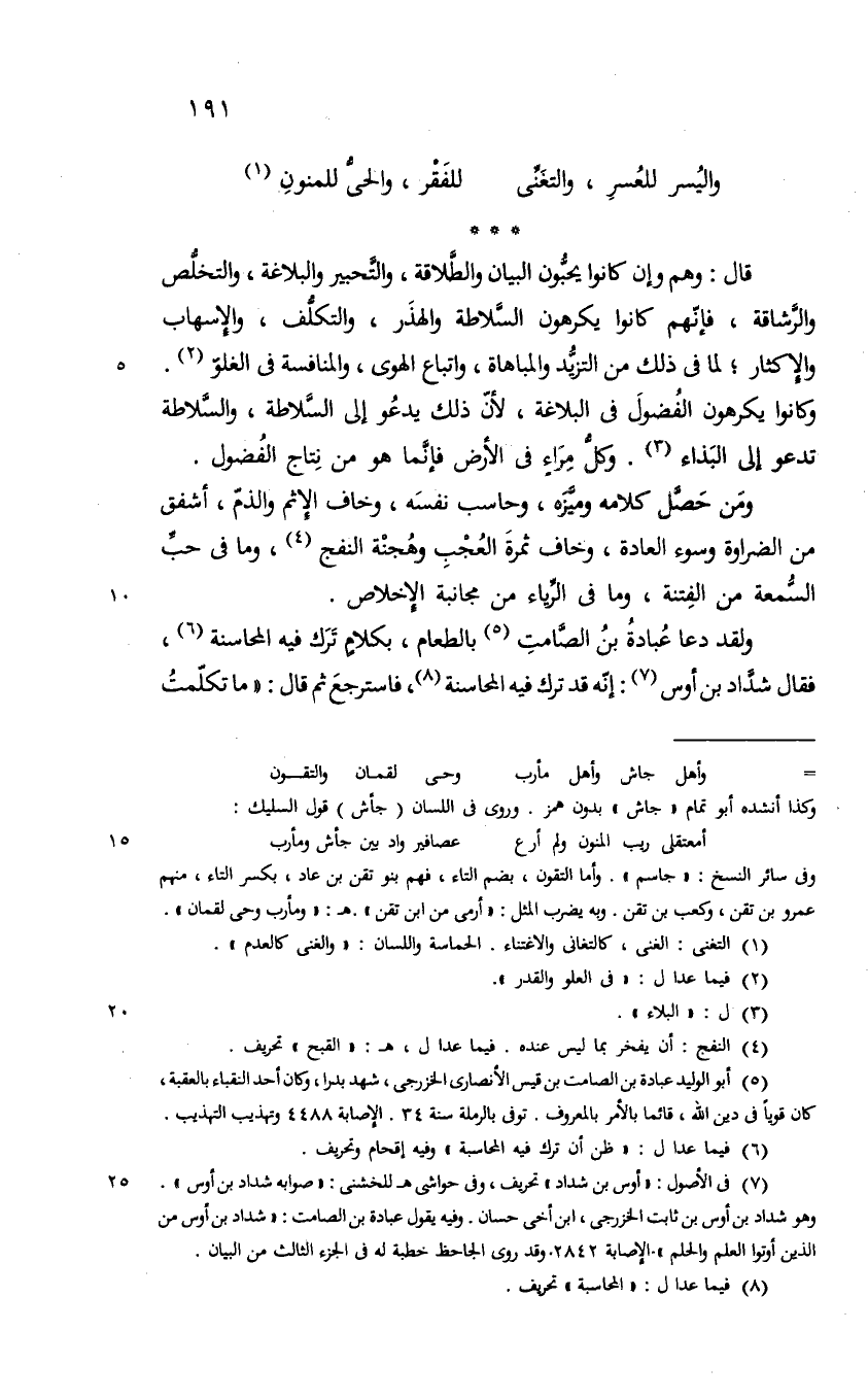 قال وهم وان كانوا يحبون البيان والطلاقة والتحبير والبلاغة والتخلص والرشاقة فانهم كانوا يكرهون السلاطة والهذر والتكلف والاسهاب والاكثار لما في ذلك من التزيد والمباهاة واتباع الهوى والمنافسة في العلو والقدر وكانوا يكرهون الفضول في البلاغة لأن ذلك يدعو الى السلاطة والسلاطة تدعو الى البذاء وكل مراء في الارض فانما هو من نتاج الفضول ومن حصل كلامه وميزه وحاسب نفسه وخالف الاثم والذم أشفق من الضراوة وسوء العادة وخاف ثمرة العجب وهجنة القبح وما في حب السمعة من الفتنة وما في الرياء من مجانبة الاخلاص