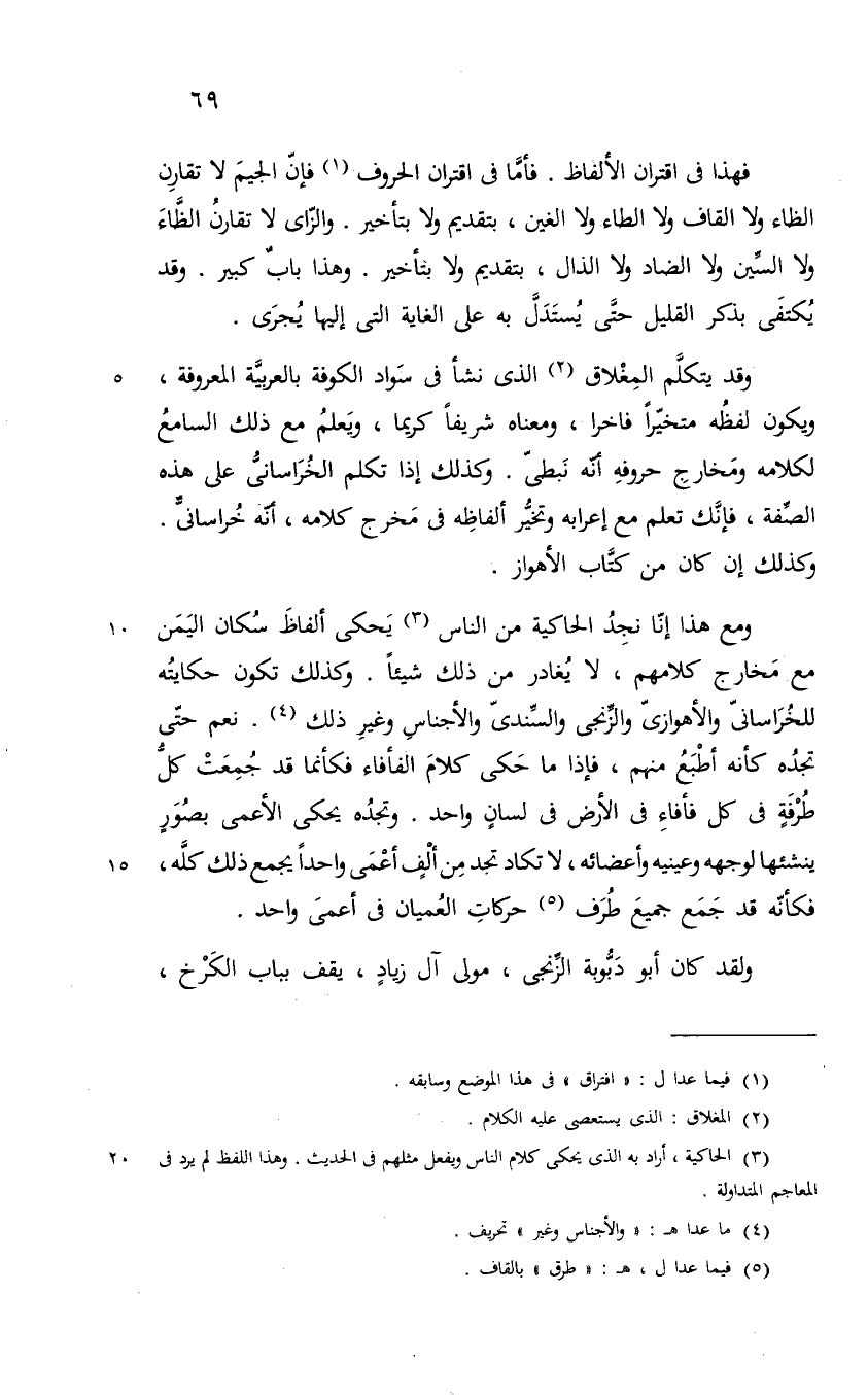 وقد يتكلم المغلاق الذي نشأ في سواد الكوفة بالعربية المعروفة ويكون لفظه متخيرا فاخرا ومعناه شريفا كريما ويعلم مع ذلك السامع لكلامه ومخارج حروفه أنه نبطي وكذلك اذا تكلم الخراساني على هذه الصفة فانك تعرف مع اعرابه وتخير ألفاظه في مخرج كلامه أنه خراساني وكذلك إن كان من كتاب الأهواز ومع هذا إنا نجد الحاكية من الناس يحكي ألفاظ سكان اليمن مع مخارج كلامهم لا يغادر من ذلك شيئا وكذلك تكون حكايته للخراساني والاهوازي والزنجي والسندي والحبشي وغير ذلك نعم حتى نجده كأنه اطبع منهم فأما اذا حكى كلام الفأفاء فكأنما قد جمعت كل اطرافه في كل فأفاء في الارض في لسان واحد كما أنك تجده يحكي الأعمى بصور ينشئها لوجهه وعينه وأعضائه لا تكاد تجد من ألف اعمى واحدا يجمع ذلك كله فكأنه قد جمع جميع طرف حركات العميان في أعمى واحد