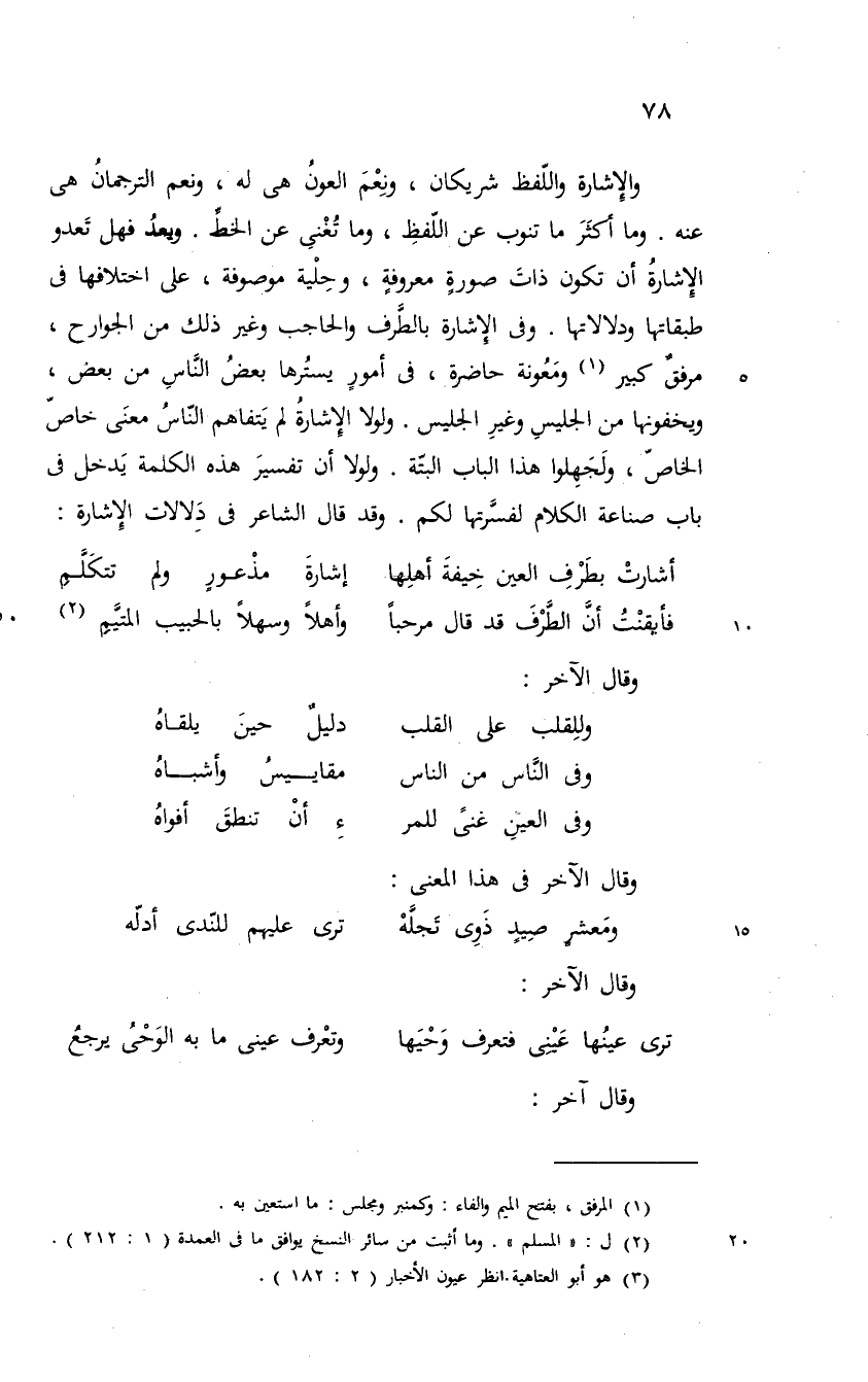 وبعد فهل تعدو الاشارة ان تكون ذات صورة معروفة وحلية موصوفة على اختلاف في طبقاتها ودلالتها وفي الاشارة بالطرف والحاجب وغير ذلك من الجوارح مرفق كبير ومعونة حاضرة في أمور يسرها الناس من بعض ويخفونها من الجليس وغير الجليس ولولا الاشارة لم يتفاهم الناس معنى خاص الخاص ولجهلوا هذا الباب البتة ولولا ان تفسير هذه الكلمة يدخل في باب صناعة الكلام لفسرتها لكم وقد قال الشاعر في دلالات الاشارة