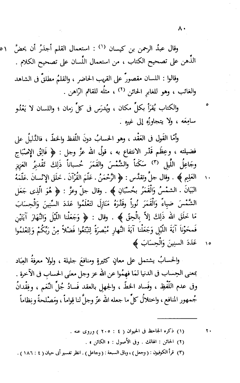 وأما القول في العقد وهو الحساب دون اللفظ والخط فالدليل على فضيلته وعظم قدر الانتفاع به قول الله عز و جل ( فالق الإصباح وجاعل الليل سكنا والشمس والقمر حسبانا ذلك تقدير العزيز العليم ) وقال جل وتقدس ( الرحمن علم القرآن خلق الانسان علمه البيان الشمس والقمر بحسبان ) وقال تبارك وتعالى ( هو الذي جعل الشمس ضياء والقمر نورا وقدره منازل لتعلموا عدد السنين والحساب ما خلق الله ذلك إلا بالحق ) وقال تبارك وتعالى ( وجعلنا الليل والنهار ايتين فمحونا اية الليل وجعلنا آية النهار مبصرة لتبتغوا فضلا من ربكم ولتعلموا عدد السنين والحساب ) والحساب يشتمل على معان كثيرة ومنافع جليلة ولولا معرفة العباد بمعنى الحساب في الدنيا لما فهموا عن الله عز و جل ذكره معنى الحساب في الاخرة