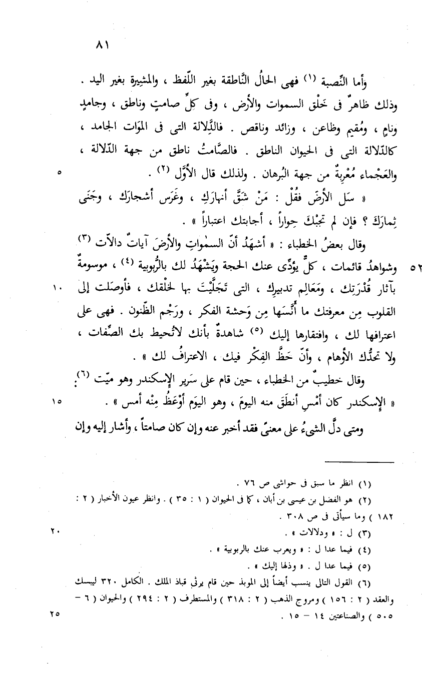 الحيوان الناطق فالصامت ناطق من جهة الدلالة والعجماء معربة من جهة البرهان ولذلك قال الاول سل الارض فقل من أجرى أنهارك وغرس أشجارك وجنى ثمارك فان لم تجبك حوارا أجابتك اعتبارا وقال بعض الخطباء أشهد ان السموات والارض آيات دالات وشواهد قائمات كل يؤدي عنك الحجة ويعرب عنك بالربوبية موسومة باثار قدرتك ومعالم تدبيرك التي تجليت بها لخلقك فأوصلت الى القلوب من معرفتك ما انسها من وحشة الفكر ورجم الظنون فهي على اعترافها لك وذلها اليك شاهدة بأنك لا تحيط بك الصفات ولا تحدك الاوهام وان حظ المفكر فيك الاعتراف لك وقال خطيب من الخطباء حين قام على سرير الاسكندر وهو ميت الاسكندر كان أمس انطق منه اليوم وهو اليوم أوعظ منه امس ومتى دل الشيء على معنى فقد أخبر عنه وان كان صامتا وأشار اليه وان @