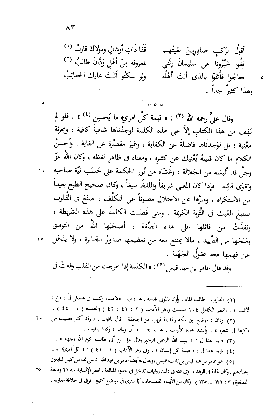 وقد قال عامر بن عبد القيس الكلمة اذا خرجت من القلب وقعت في @