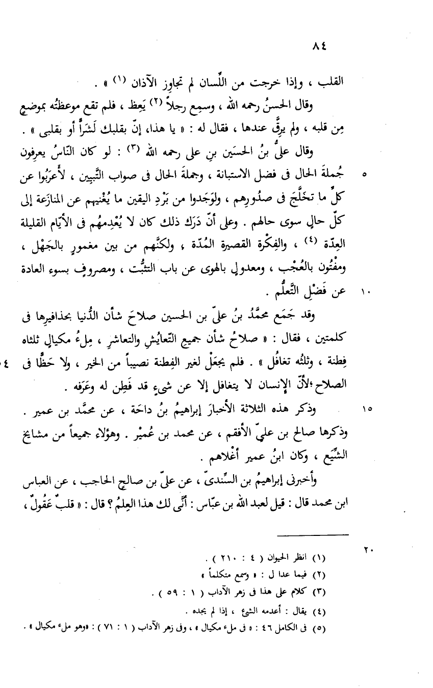 وأخبرني ابراهيم بن السندى عن علي بن صالح الحاجب عن العباس بن محمد قال قيل لعبد الله بن عباس أنى لك هذا العلم قال قلب عقول@