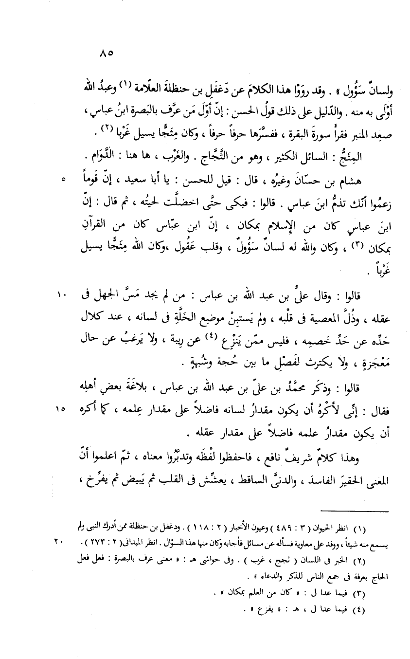 ولسان سؤول وقد رووا هذا الكلام عن دغفل بن حنظلة العلامة وعبد الله أولى به منه والدليل على ذلك قول الحسن ان اول من عرف بالبصرة ابن عباس صعد المنبر فقرأ سورة البقرة ففسرها حرفا حرفا وكان مثجا يسيل غربا