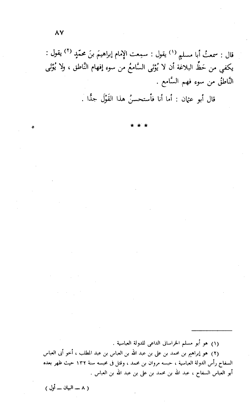 قال سمعت أبا مسلم يقول سمعت الامام ابراهيم بن محمد يقول يكفي من حظ البلاغة ان لا يؤتى السامع من سوء إفهام الناطق ولا يؤتى الناطق من سوء فهم السامع