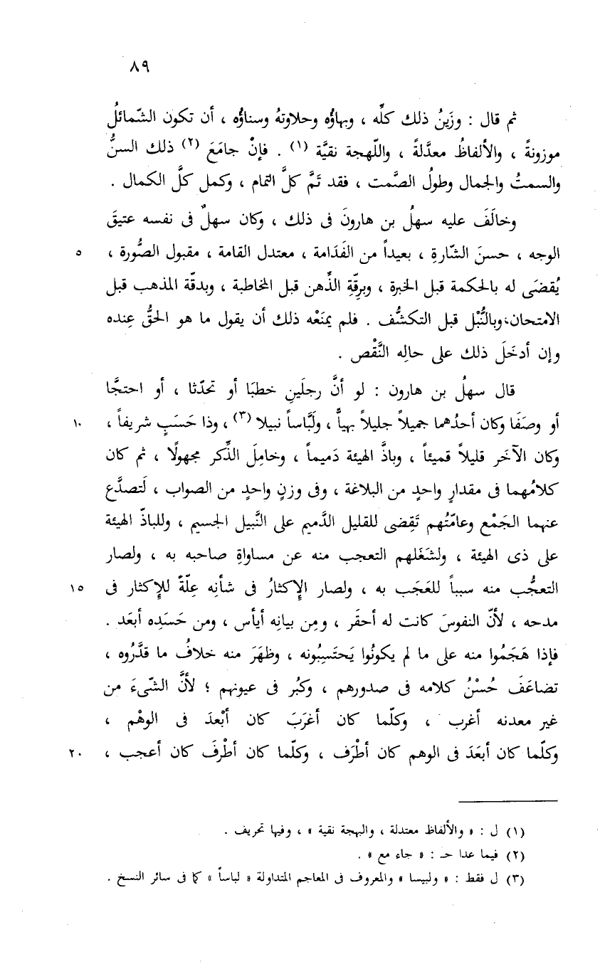 ثم قال وزين ذلك كله وبهاؤه وحلاوته وسناؤه ان تكون الشمائل موزونة والالفاظ معدلة واللهجة نقية فان جامع ذلك السن والسمت والجمال وطول الصمت فقد ثم كل التمام وكمل كل الكمال