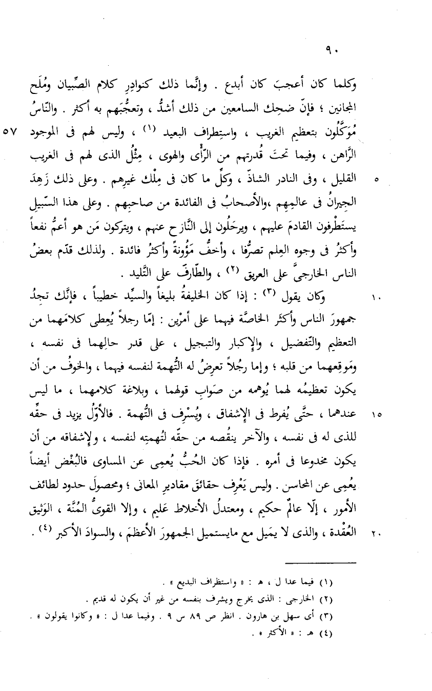 ولذلك قدم بعض الناس الخارجي على العريق والطارف على التليد وكانوا يقولون اذا كان الخليفة بليغا والسيد خطيبا فإنك تجد جمهور الناس وأكثر الخاصة فيهما على أمرين إما رجلا يعطي كلامهما من التعظيم والتفضيل والاكبار والتبجيل على قدر حالهما في نفسه وموقعهما من قلبه وإما رجلا تعرض له