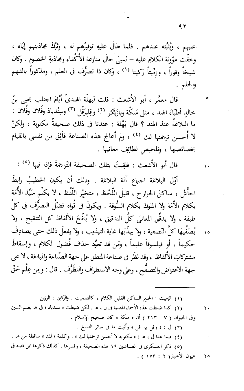 قال معمر ابو الاشعث قلت لبهلة الهندي - ايام اجتلب يحيى بن خالد اطباء الهند مثل منكة وبازيكر وقلبرقل وسندباذ وفلان وفلان - ما البلاغة عند اهل الهند قال بهلة عندنا في ذلك صحيفة مكتوبة لا أحسن ترجمتها لك ولم أعالج هذه الصناعة فأثق من نفسي بالقيام بخصائصها وتلخيص لطائف معانيها قال ابو الاشعث فلقيت بتلك الصحيفة التراجمة فاذا فيها