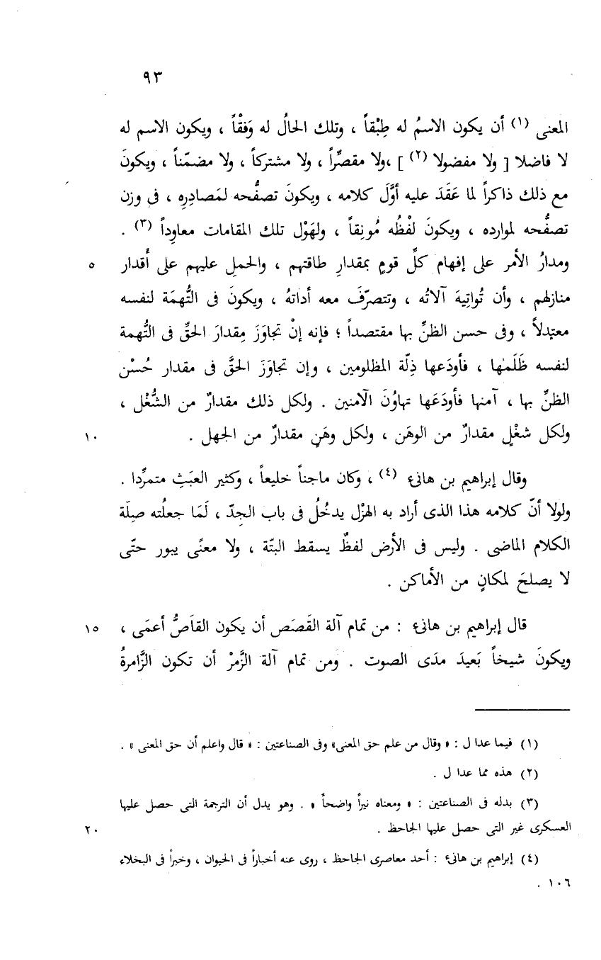 المعنى ان يكون الاسم له طبقا وتلك الحال له وفقا ويكون الاسم له لا فاضلا ولا مفضولا ولا مقصرا ولا مشتركا ولا مضمنا ويكون مع ذلك ذاكرا لما عقد عليه اول كلامه ويكون تصفحه لمصادره في وزن تصفحه لموارده ويكون لفظه مؤنقا ولهول تلك المقامات معاودا ومدار الامر على إفهام كل قوم بقدر طاقتهم والحمل عليهم على اقدار منازلهم وان تواتيه الته وتتصرف معه أداته ويكون في التهمة لنفسه معتدلا وفي حسن الظن بها مقتصدا فانه ان تجاوز مقدارالحق في التهمة لنفسه ظلمها فأودعها ذلة المظلومين وان تجاوز الحق في مقدار حسن الظن بها أمنها فأودعها تهاون الآمنين ولكل ذلك مقدار من الشغل ولكل شغل مقدار من الوهن ولكل وهن مقدار من الجهل