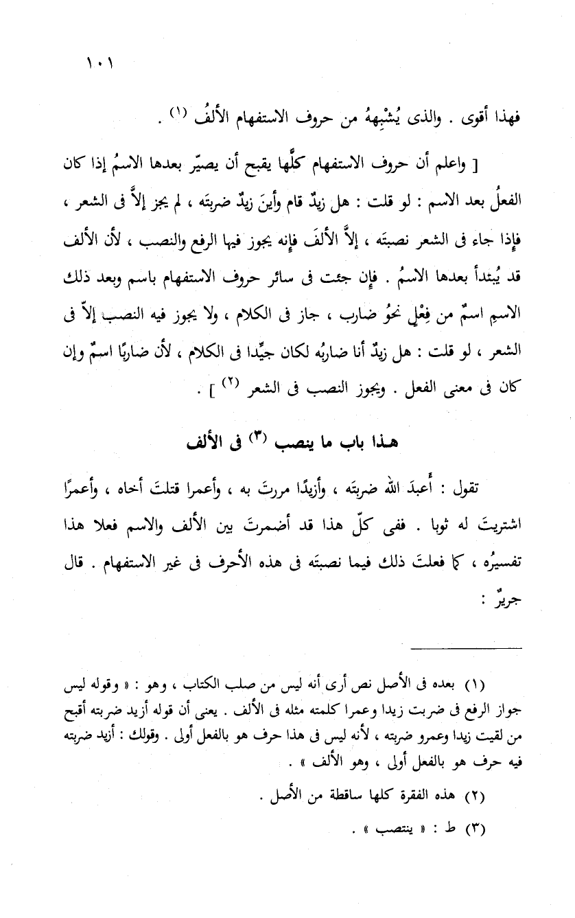 " واعلم أ، حروف الاستفهام كلَّها يقبح أن يصيرّ بعدها الاسمُ إذا كان الفعل بعد الاسم: لو قلت: هل زيدٌ قام وأينَ زيدٌ ضربتَه، لم يجز إلاَّ فى الشعر، فإذا جاء فى الشعر نصبتَه، إلاَّ الألفَ فإِنه يجوز فيها الرفع والنصب، لأن الألف قد يُبتدأ بعدها الاسمُ. فإِن جئت فى سائر حروف الاستفهام باسم وبعد ذلك الاسمِ اسمٌ من فِعْلٍ نحُو ضارب، جاز فى الكلام، ولا يجوز فيه النصب إلاّ فى الشعر، لو قلت: هل زيدٌ أنا ضاربُه لكان جيَّدا فى الكلام، لأن ضارباً اسمٌ وإن كان فى معنى الفعل. ويجوز النصب فى الشعر ".