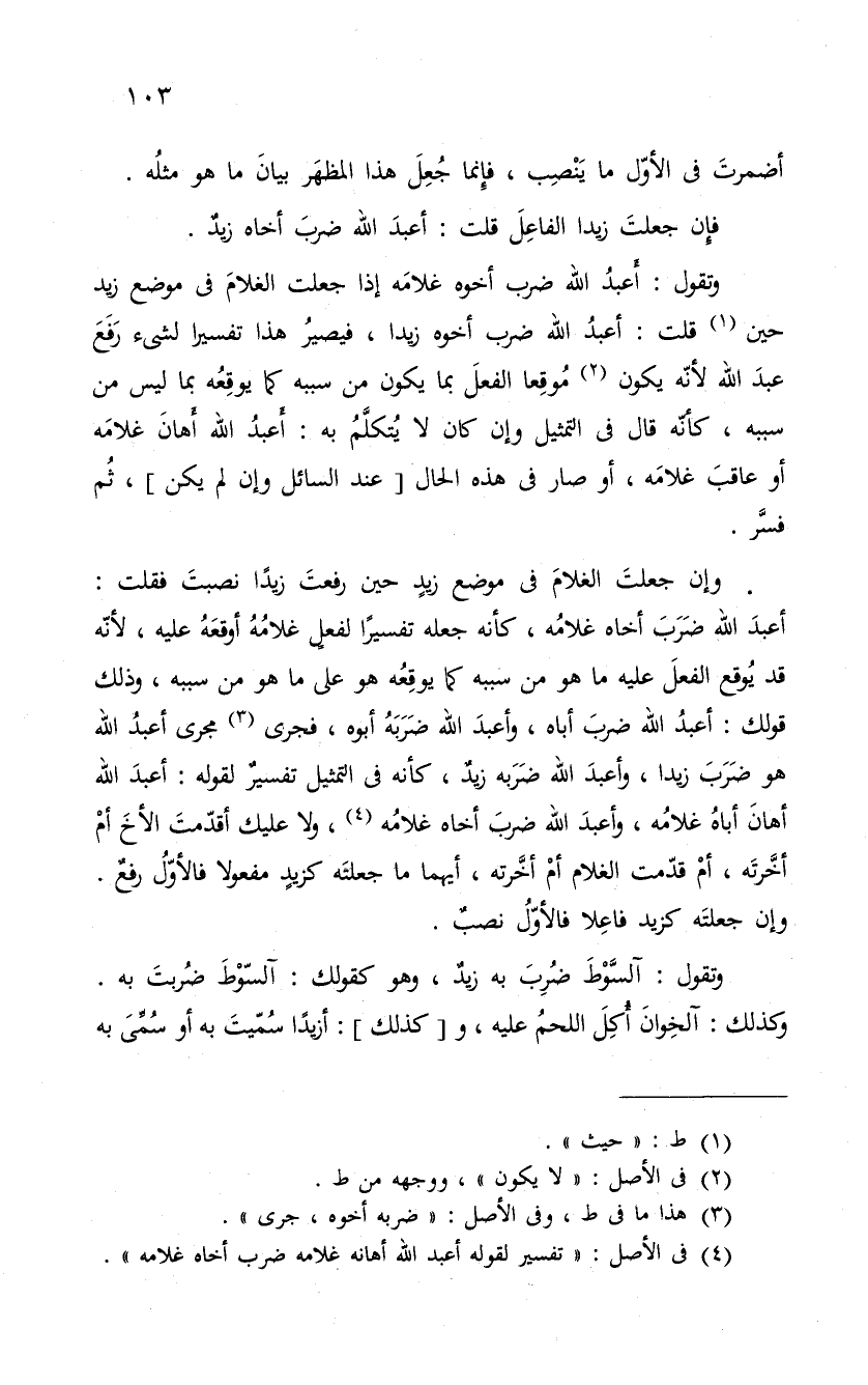 وإن جعلتَ الغلامَ فى موضع زيدٍ حين رفعتَ زيداً نصبتَ فقلت: أعبدَ الله ضَرَبَ أخاه غلامُه، كأنه جعله تفسيراً لفعلٍ غلامُهُ أوقعَهُ عليه، لأنّه قد يوُقع الفعلَ عليه ما هو من سببه كما يوقِعُه هو على ما هو من سببه، وذلك قولك: أعبدُ الله ضربَ أباه، وأعبدَ الله ضَرَبَهُ أبوه، فجرى مجرى أعبدُ الله هو ضرب زيداً، وأعبد ضَرَبه زيدٌ، كأنه فى التمثيل تفسيرٌ لقوله: أعبدَ الله أهانَ أباهُ غلامُه، وأعبدَ الله ضربَ أخاه غلامُه. ولا عليك أقدّمتَ الأخَ أمْ أخَّرتَه، أمْ قدّمت الغلام أمْ أخَّرته، أيهما ما جعلتَه كزيدٍ مفعولا فالأوّل رفعٌ. وإن جعلتَه كزيد فاعِلا فالأوّلُ نصبٌ.
