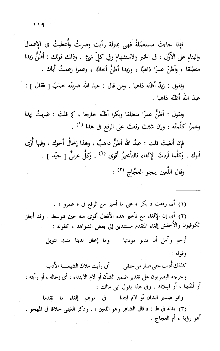 فإِن ألغيتَ قلت: عبدُ الله أظنُّ ذاهبٌ، وهذا إخالُ أخوك، وفيها أُرَى أبوك. وكلَّما أردتَ الإِلغاء فالتأخيرُ أقوى. وكلٌّ عربىٌّ " جيدّ ".