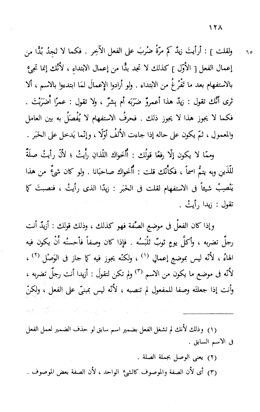 ولقلت: أرأيتَ زيدٌ كم مّرةً ضُربَ على الفعل الآخِر. فكما لا تَجِدُ بُدّاً من إعمال الفعل " الأوّل " كذلك لا تجد بدًّا من إعمال الابتداء، لأنك إنما تجيء بالاستفهام بعدما تَفْرُغُ من الابتداء. ولو أرادوا الإعمالَ لمَا ابتدءوا بالاسم، ألا تَرى أنَّك تقول: زيدٌ هذا أعمروٌ ضَرَبَه أم بِشرٌ، ولا تقول: عمراً أَضَرَبْتَ. فكما لا يجوز هذا لا يجوز ذلك. فحرفُ الاستفهام لا يُفْصَلُ به بين العامل والمعمولِ، ثمّ يكون على حاله إذا جاءت الألفُ أوّلاً، وإنّما يَدخل على الخَبَر.