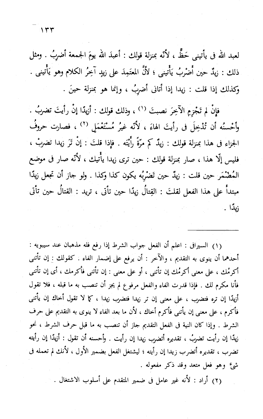 فإِن لم تَجْزِمِ الآخِرَ نصبتَ، وذلك قولك: أزيداً إنْ رأيتَ تضربُ. وأحْسنُه أن تُدْخِلَ فى رأيتَ الهاءَ، لأنّه غيرُ مُسْتَعْمَلٍ، فصارت حروفُ الجزاء فى هذا بمنزلة قولك: زيدٌ كم مرّةً رأيْتَه. فإِذا قلتَ: إنْ تَرَ زيدا تضربْ، فليس إلاّ هذا، صار بمنزلة قولك: حين ترى زيدا يأْتيك، لأنّه صار فى موضع المُضْمْرَ حين قلت: زيدٌ حين تَضْرِبُه يكون كذا وكذا. ولو جاز أن تجعل زيداً مبتدأَ على هذا الفعل لقلتَ: القِتالُ زيداً حين تأتى، تريد القتالُ حين تأتى زيداً.
