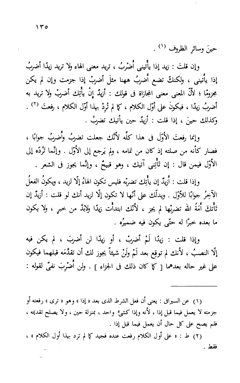 وإن قلتَ: زيد إذا يأْتينى أَضرْبُ، تريد معنى الهاء ولا تريد زيداً أضربُ إذا يأتينى، ولكنكّ تضع أَضربُ ههنا مثلَ أضربْ إذا جزمت وإن لم يكن مجزوماً؛ لأنّ المعنى معنى المجازاة فى قولك: أزيدٌ إِنْ يأْتِك أضربْ ولا تريد به أضربُ زيداً، فيكونَ على أوّل الكلام، كما لم تُرِدْ بهذا أوّل الكلام، رفعتَ. وكذلك حينَ، إذا قلت: أزيدٌ حين يأتيك تضربُ.