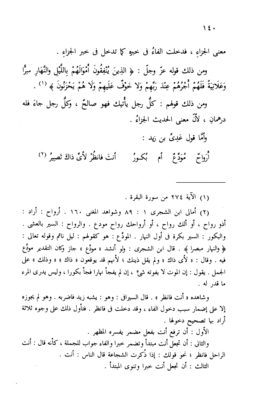 ومن ذلك قوله عزّ وجلّ: الذِينَ يُنْفِقُونَ أَمْوَالَهُمْ بِاللَّيْلِ والنَّهَارِ سِرًّا وَعَلاَنِيَةً فَلَهُمْ أَجْرُهُمْ عِنْدَ رَبَّهِمْ وَلا خَوْفٌ عَلَيهِمْ وَلاَ هُمْ يَحْزَنُونَ ".
