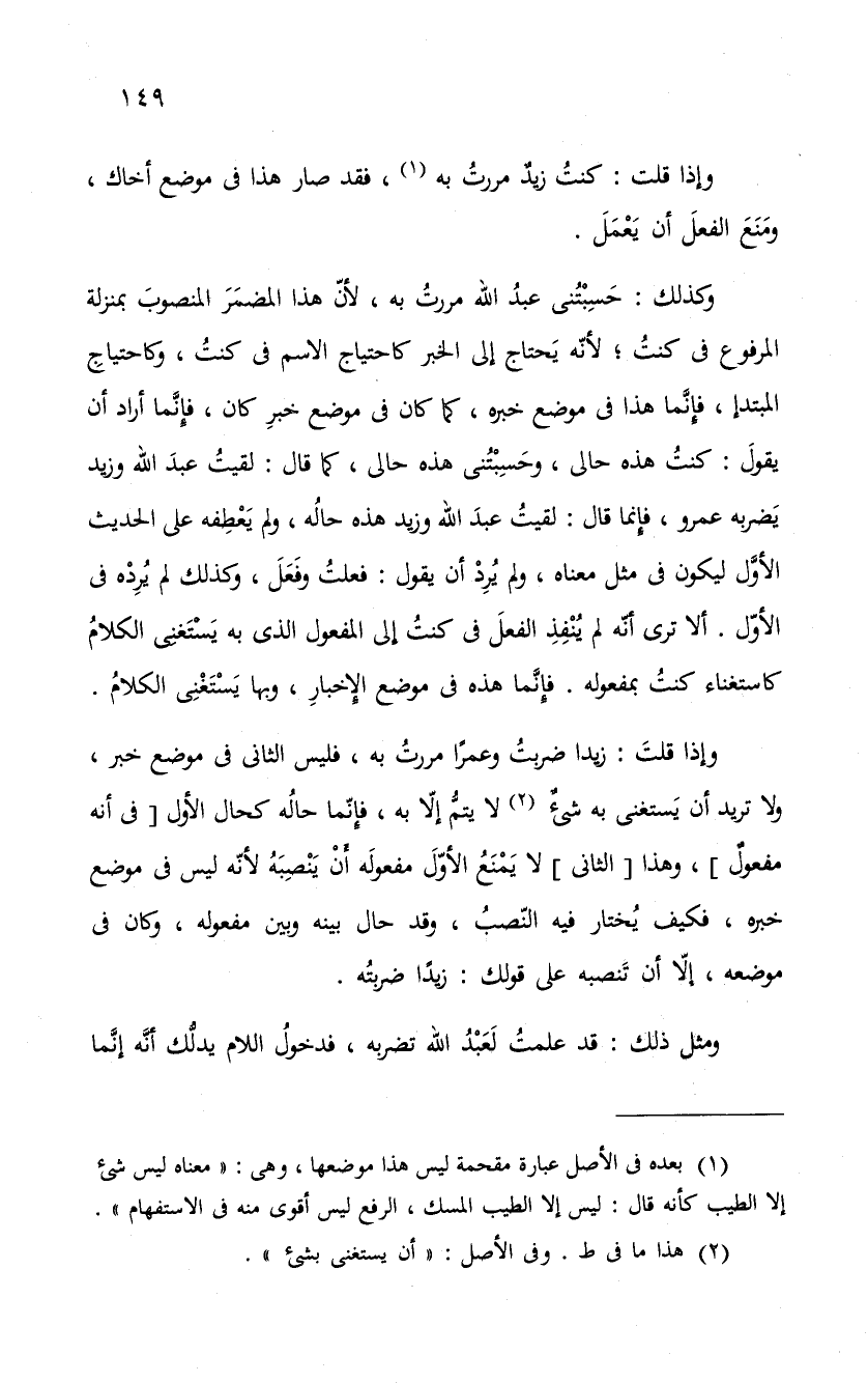 وكذلك: حَسِبْتُنى عبدُ الله مررتُ به، لأنّ هذا المضمَرَ المنصوبَ بمنزلة المرفوع فى كنتُ؛ لأنّه يَحتاج إلى الخبر كاحتياج الاسم فى كنتُ، وكاحتياجِ المبتدإ، فإِنَّما هذا فى موضع خبره، كما كان فى موضع خبرِ كان، فإِنَّما أراد أن يقولَ: كنتُ هذه حالى، وحَسِبتُنى هذه حالى، كما قال: لقيتُ عبدَ الله وزيد يضربه عمرو، فإنما قال: لقيت عبد الله وزيد هذه حالُه، ولم يَعْطِفه على الحديث الأوَّل ليكون في مثل معناه، ولم يُرِدْ أن يقول: فعلتُ وفَعَلَ، وكذلك لم يُرِدْه فى الأوّل. ألا ترى أنّه لم يُنْفِذِ الفعلَ فى كنتُ إلى المفعول الذى به يَسْتَغنىِ الكلامُ كاستغناء كنتُ بمفعوله. فإِنَّما هذه فى موضع الإِخبارِ، وبها يَسْتَغنِى الكلامُ.