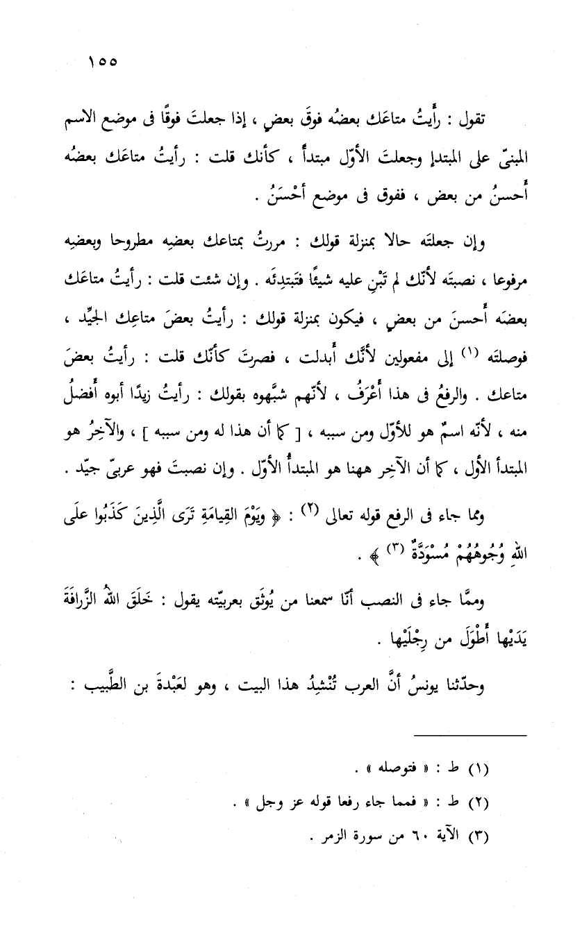 وممَّا جاء فى النصب أنّا سمعنا من يُوثَق بعربيّته يقول: خَلَقَ الله الزرافة يديها طول من رِجْلَيْها.