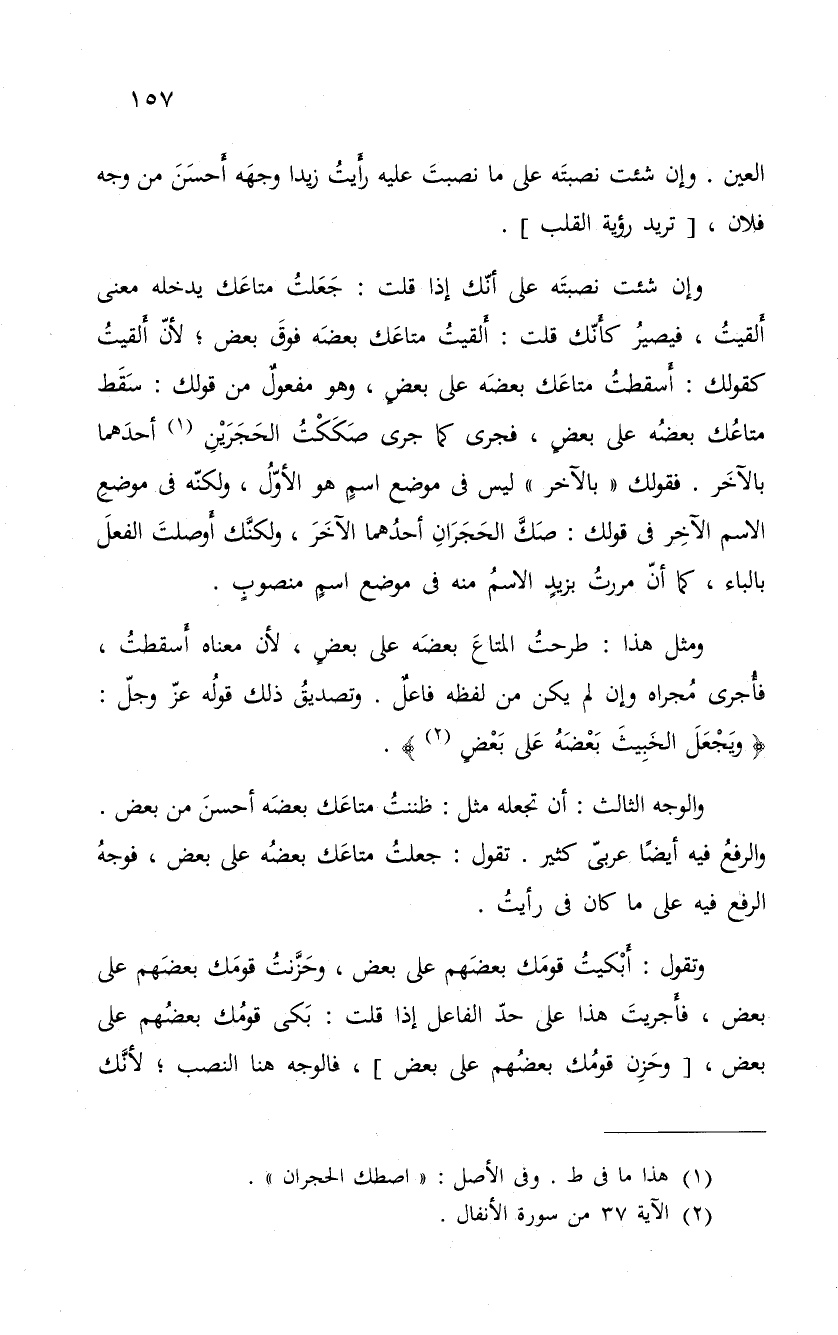 وإن شئت نصبتَه على أنّك إذا قلت: جَعَلتُ متاعَك يدخله معنى أَلقيتُ، فيصيرُ كأَنّك قلت: أَلقيتُ متاعَك بعضَه فوقَ بعض؛ لأنّ أَلقيتُ كقولك: أَسقطتُ متاعَك بعضَه على بعضٍ، وهو مفعولٌ من قولك: سَقَط متاعُك بعضُه على بعضٍ، فجرى كما جرى صَكَكْتُ الحَجَرَينِ أحدَهما بالآخَر. فقولك " بالآخر " ليس فى موضع اسمٍ هو الأوّلُ، ولكنّه فى موضعِ الاسم الآخِر فى قولك: صَكَّ الحَجَرَانِ أحدُهما الآخَرَ، ولكَّنك أَوصلتَ الفعلَ بالباء، كما أنّ مررتُ بزيدٍ الاسمُ منه في موضع اسمٍ منصوبٍ.