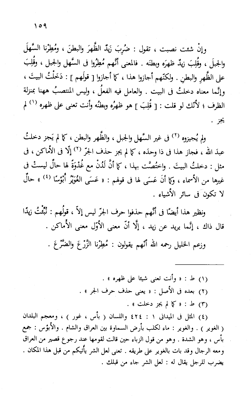 ولم يُجيزوه فى غير السَّهل والجبل، والظَّهر والبطن، كما لم يَجز دخلت عبد الله، فجاز هذا في هذا وحده، كما لم يجز حذف حرف الجرّ إلاّ فى الأماكن، فى مثل: دخلتُ البيتَ. واختُصَّت بهذا، كما أنَّ لَدُنْ مع غُدْوَةً لها حالٌ ليستْ فى غيرها من الأسماء، وكما أنَ عَسَى لها فى قولهم: " عَسَى الغُوَيرُ أَبؤساً " حالٌ لا تكون فى سائر الأشياء.
