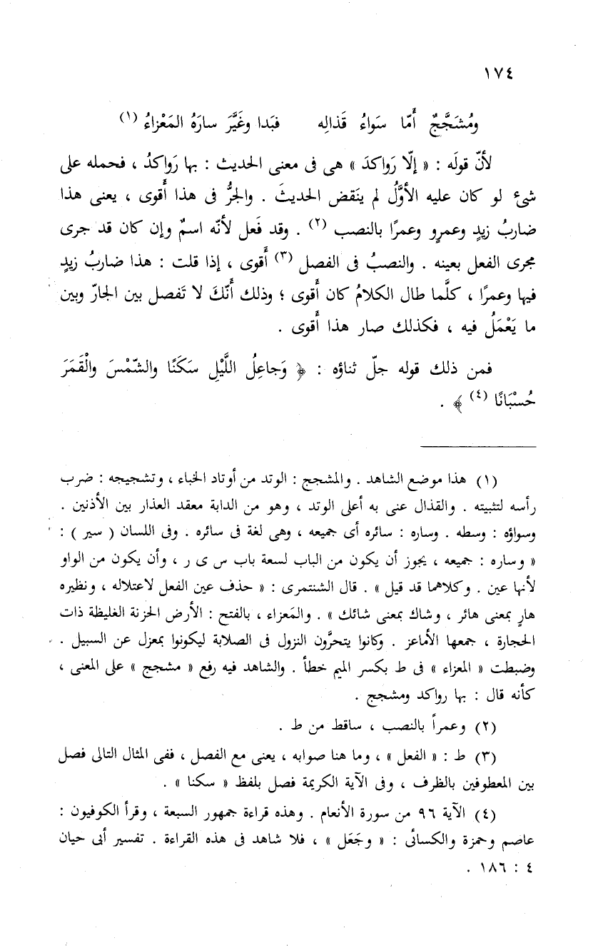 فمن ذلك قوله جلّ ثناؤه: " وَجاعِلُ اللَّيْلِ سَكَناً والشّمسَ والْقَمَرَ حسباناً ".