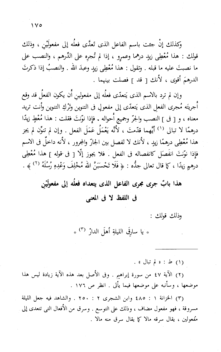 وإن لم ترد بالاسم الذى يَتعدّى فعلُه إلى مفعولينِ أَن يكون الفعلُ قد وقع أَجريتَه مُجرى الفعلِ الذى يَتعدّى إلى مفعولٍ في التنوين وتَرْكِ التنوين وأنت تريد معناه، و " في " النصب والجرّ وجميعِ أَحواله، فإِذا نوّنتَ فقلت: هذا معط زيداً درهماً لا تبالي أيَّهما قدّمتَ، لأنَّه يَعمَلُ عَمَلَ الفعل. وإن لم تنوَّن لم يجز هذا مُعْطِى درهماً زيدٍ، لأنك لا تَفصل بين الجارّ والمجرور، لأنه داخلٌ فى الاسم فإِذا نوّنتَ انفَصَل كانفصاله فى الفعل. فلا يجوز إلاّ " فى قوله " هذا معطى زيداً، كما قال تعالى جدُّه: " فلا تحسبن الله مخلف وعده رسله ".