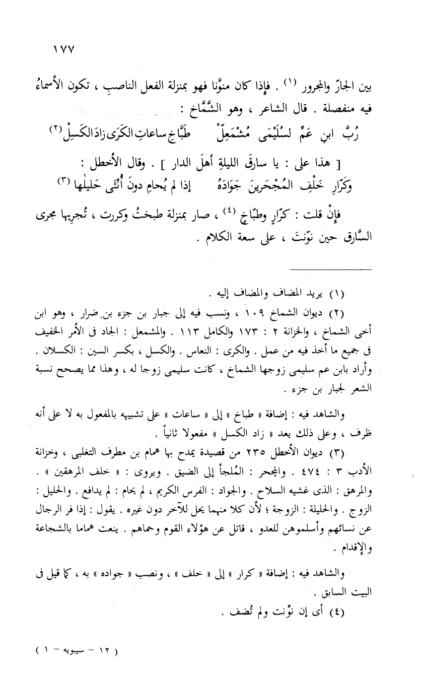 بين الجارّ والمجرور. فإِذا كان منوَّنا فهو بمنزلة الفعل الناصبِ، تكون الأسماءُ فيه منفصلة. قال الشاعر، وهو الشَّمَّاخ: