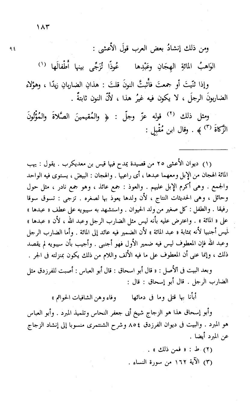 ومثل ذلك قوله عز وجل: " والمقيمين الصلاة والمؤتون الزكاة ". وقال ابن مُقْبِلٍ: