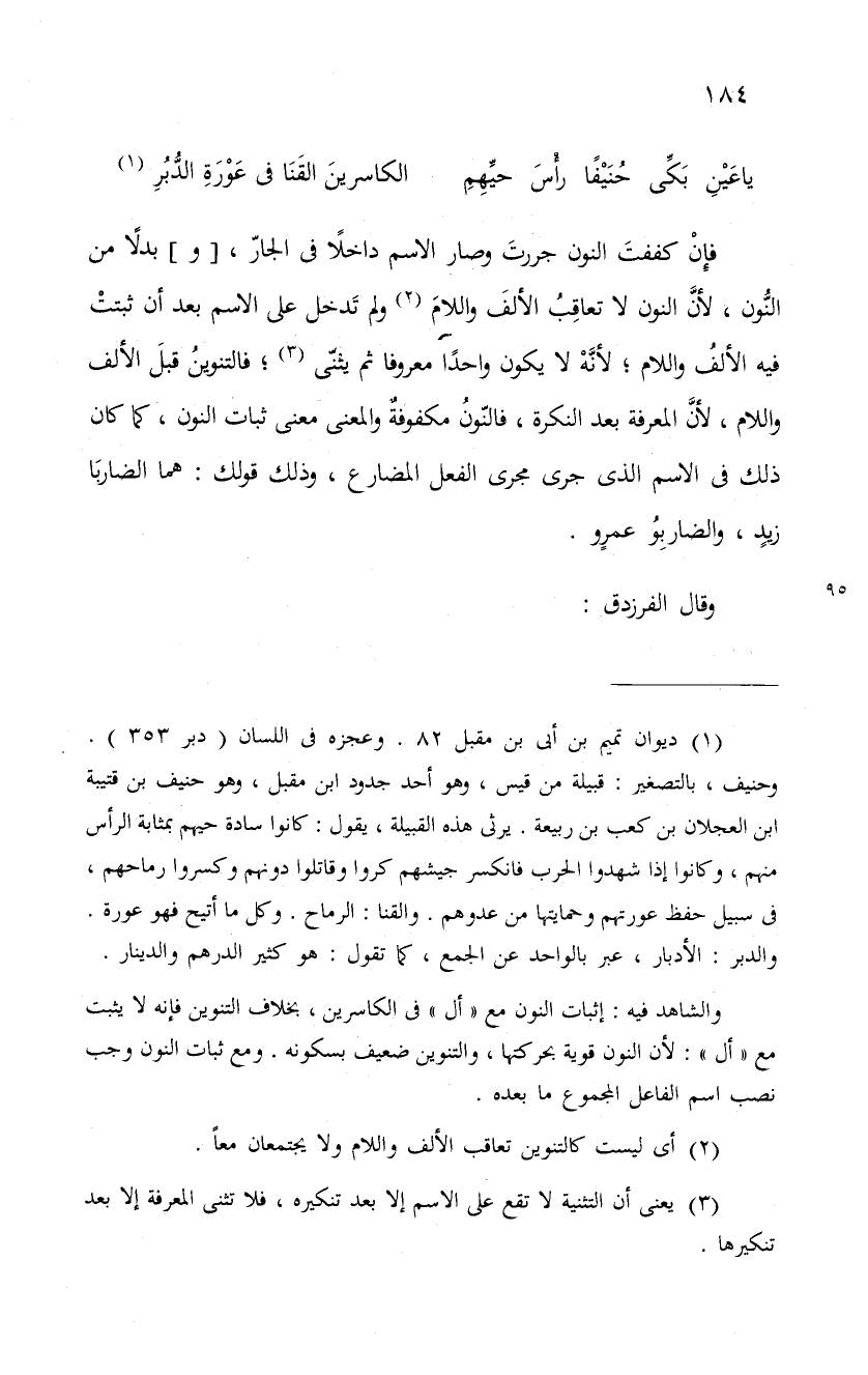يا عَيْنِ بَكَّى حُنَيفْاً رأَسَ حيِّهِمِ ... الكاسرينَ القَنَا فى عَوْرَةِ الدُّبُرِ
