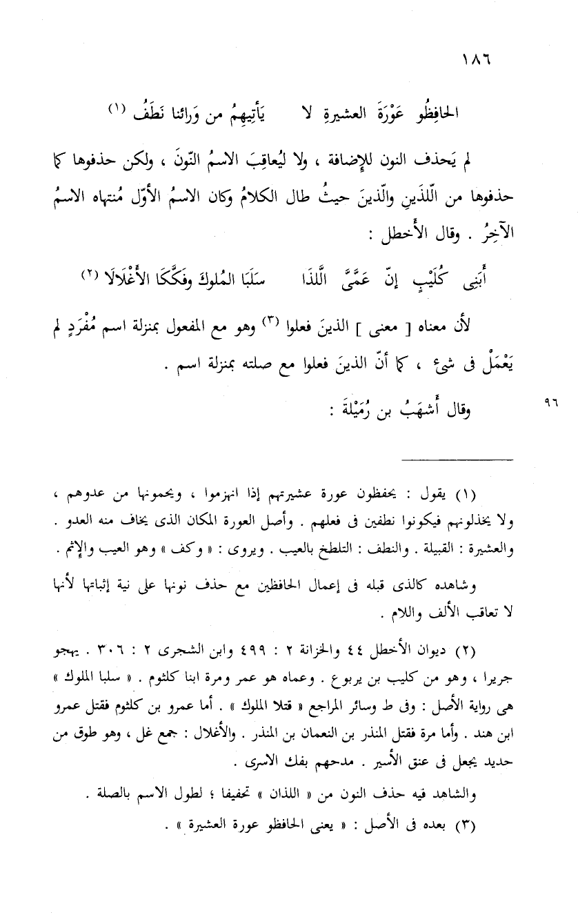 لم يَحذف النون للإِضافة، ولا ليُعاقِبَ الاسمُ النّونَ، ولكن حذفوها كما حذفوها من الّلذَينِ والّذينَ حيثُ طال الكلامُ وكان الاسمُ الأوّل مُنتهاه الاسمُ الآخِرُ. وقال الأَخطل: