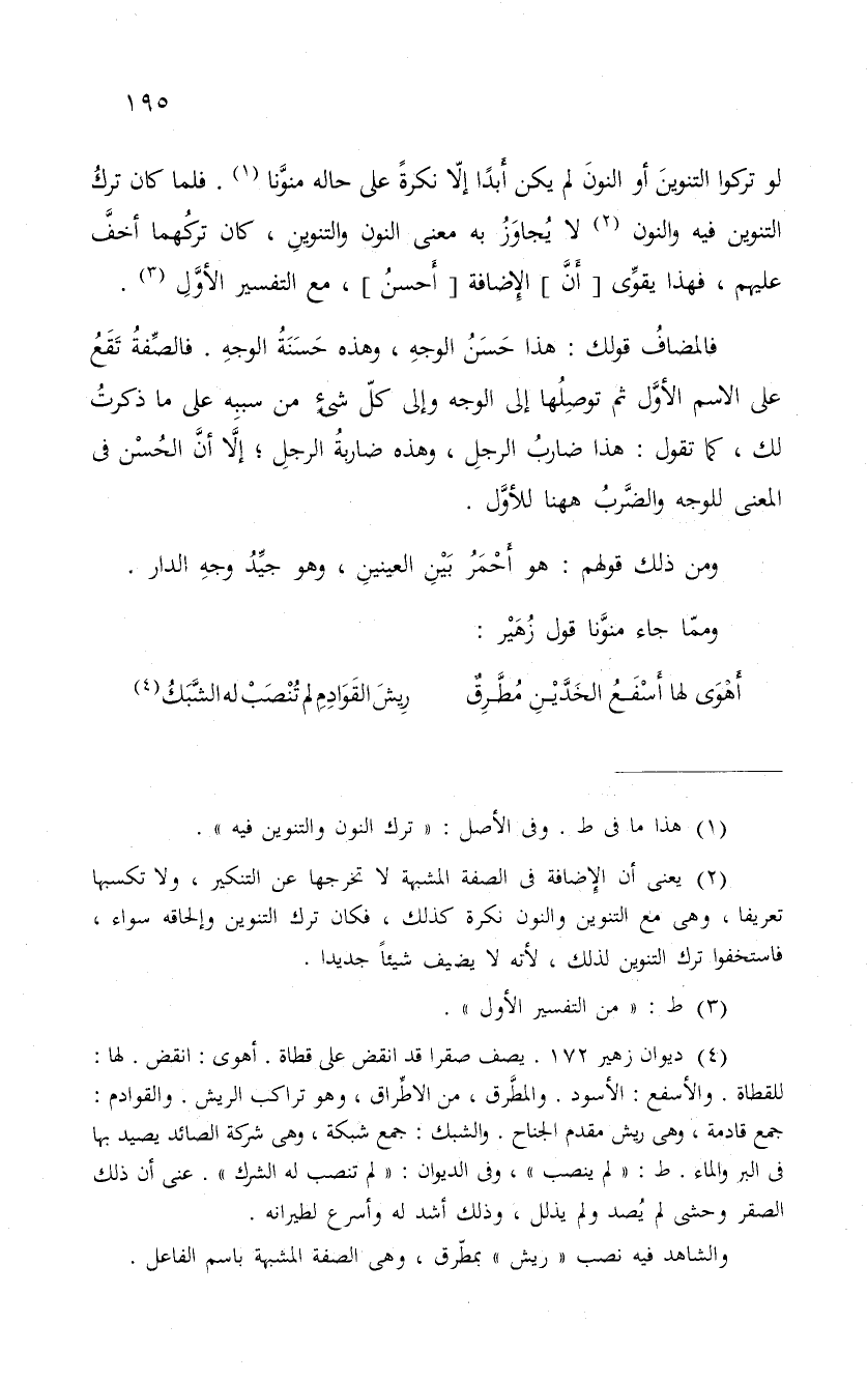 لو تركوا التنوينَ أو النونَ لم يكن أَبداً إلاّ نكرةً على حاله منوَّنا. فلما كان تركُ التنوين فيه والنون لا يُجاوَزُ به معنى النون والتنوين، كان تركُهما أخفَّ عليهم، فهذا يقوَّى " أَنَّ " الإِضافة " أَحسنُ "، مع التفسير الأوَّلِ.