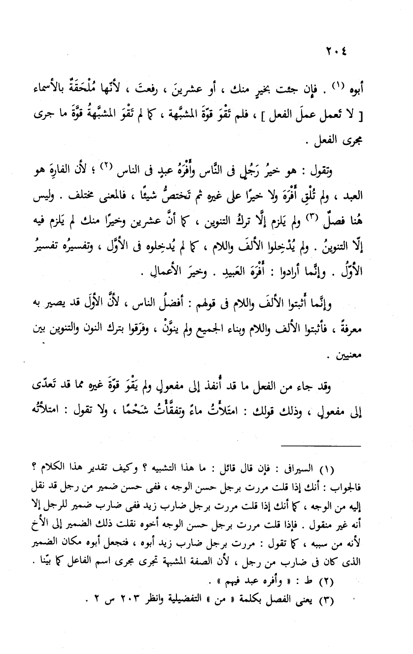 أبوه. فإِن جئت بخيرٍ منك، أو عشرينَ، رفعتَ، لأنّها مُلْحَقَةٌ بالأسماء " لا تَعمل عملَ الفعل "، فلم تقو قوة المشبهة، كما لم تَقْوَ المشبَّهةُ قوَّةَ ما جرى مجرى الفعل.