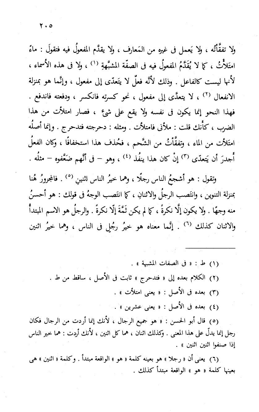 ولا تفقَّأتُه. ولا يَعمل فى غيره من المَعارف، ولا يقدَّم المفعولُ فيه فتقولَ: ماءً امتَلأْتُ، كما لا يُقَدَّمُ المفعولُ فيه فى الصفةّ المشبَّهةِ، ولا فى هذه الأسماء، لأنها ليست كالفاعل. وذلك لأنَّه فعلٌ لا يتَعدّى إلى مفعول، وإنَّما هو بمنزلة الانفعال، لا يتعدَّى إلى مفعول، نحو كسرته فانكسر، ودفعته فاندفع. فهذا النحو إنما يكون فى نفسه ولا يقع على شيء، فصار امتلأت من هذا الضرب، كأَنك قلت: ملأنى فامتلأت. ومثله: دحرجته فتدحرج. وإنما أصلُه امتَلأت من الماء، وتفقَّأتُ من الشَّحم، فحُذف هذا استخفافاً، وكان الفعلُ أَجدرَ أن يَتعدّى إنْ كان هذا ينفُذ، وهو - فى أنّهم ضعَفَّوه - مثله.