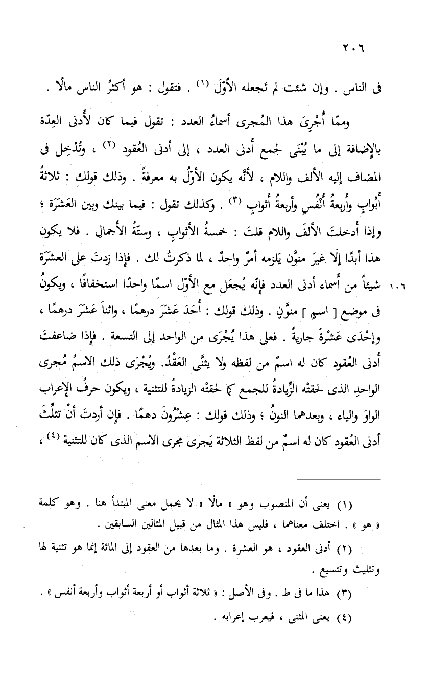 وممّا أُجْرِىَ هذا المُجرى أسماء العدد: تقول فيما كان لأَدنى العِدّة بالإِضافة إلى ما يُبْنَى لجمع أَدنى العدد، إلى أدنى العُقود، وتُدْخِل فى المضاف إليه الألف واللام، لأنَّه يكون الأوّلُ به معرفةً. وذلك قولك: ثلاثة أبواب وأربعة أنفس وأربعة أثواب. وكذلك تقول: فيما بينك وبين العَشَرَة؛ وإذا أَدخلتَ الألفَ واللام قلت: خمسة الأثواب، وستة الجمال. فلا يكون هذا أبداً إلا غيرَ منوَّن يَلزمه أمرٌ واحدٌ، لما ذكرتُ لك. فإِذا زدتَ على العشَرَة شيئاً من أَسماء أدنى العدد فإِنّه يُجعَل مع الأوّل اسماً واحداً استخفافاً، ويكونُ فى موضع " اسمٍ " منَّونٍ. وذلك قولك: أَحَدَ عَشَرَ درهماً، واثناَ عَشَرَ درهماً، وإحْدَى عشر جاريةً. فعلى هذا يُجرَى من الواحد إلى التسعة. فإِذا ضاعفتَ أَدنى العُقود كان له اسمٌ من لفظه ولا يثنَّى العَقدُ. ويُجْرَى ذلك الاسمُ مُجرى الواحدِ الذى لحقتْه الزيَّادةُ للجمع كما لحقتْه الزيادةُ للتثنية ويكون حرفُ الإِعراب الواوَ والياء وبعدهما النونُ؛ وذلك قولك: عِشْرُونَ درهماً. فإِن أردتَ أنْ تثلَّثَ أدنى العُقود كان له اسمٌ من لفظ الثلاثة يَجرى مجرى الاسم الذى كان للتثنية،