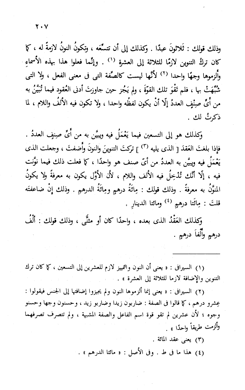 وكذلك هو إلى التسعين فيما يَعمْلُ فيه ويبيَّن به من أىَ صِنفٍ العددُ. فإِذا بلغت العدد " الذى يليه " تركتَ التنوينَ والنونَ وأَضفتَ، وجعلت الذى يَعْمَلُ فيه ويبَّين به العددُ من أي صنف هو واحداً، كما فعلت فيما نوَّنت فيه، إلاّ أنَّك تُدْخِلُ فيه الألف واللام، لأن الأوَّل يكون به معرفةً ولا يكونُ المنَّونُ به معرفةً. وذلك قولك: مِائَةُ درهمٍ ومِائَةُ الدرهمِ. وذلك إنْ ضاعفتَه قلتَ: مِائَتا درهمٍ ومائتا الدينارِ.