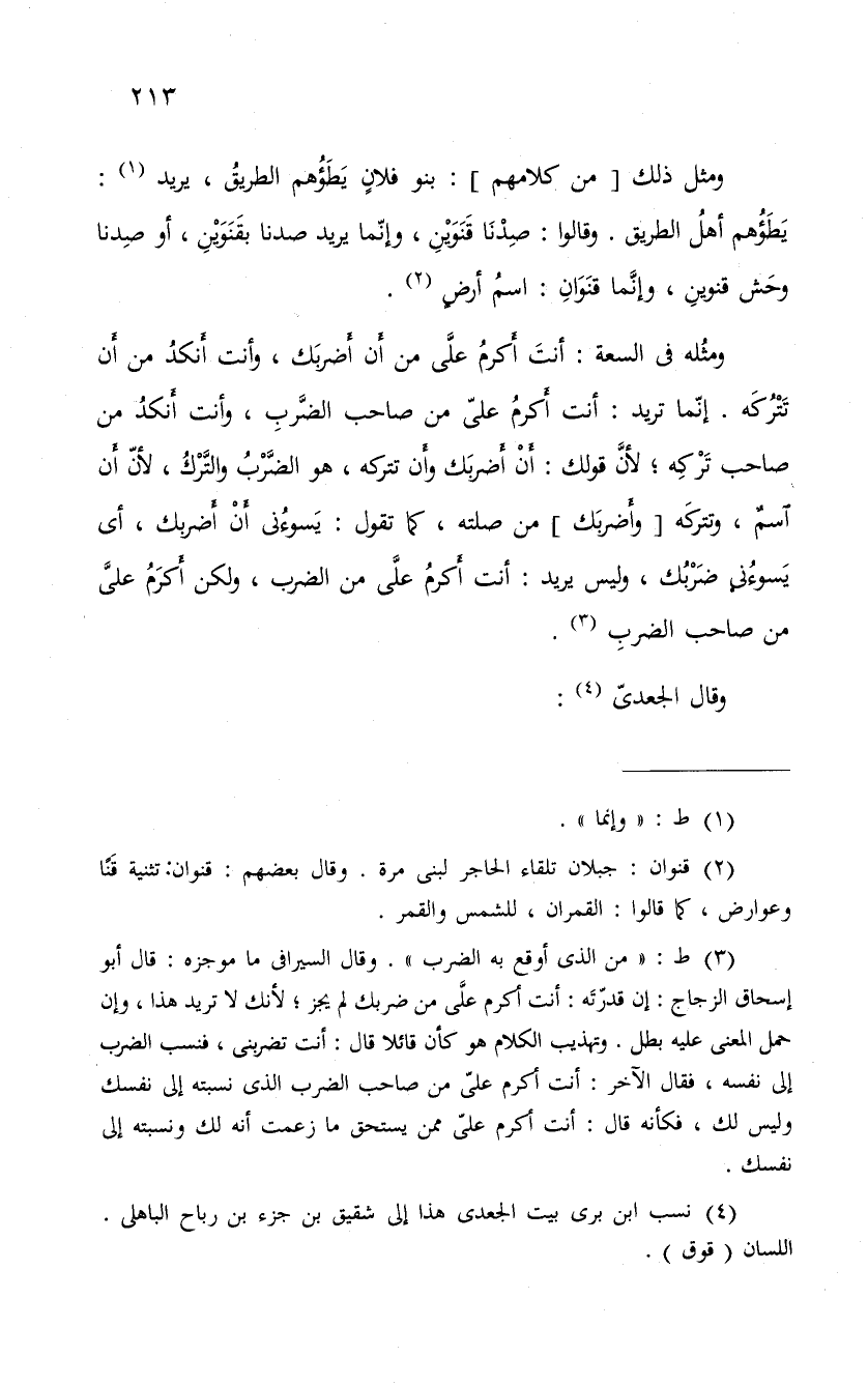 ومثل ذلك " من كلامهم ": بنو فلانٍ يَطَؤُهم الطريقُ، يريد: يَطَؤُهم أهلُ الطريق. وقالوا: صِدْنَا قَنَوَيْنِ، وإنّما يريد صدنا بقَنَوَيْنِ، أو صِدنا وحَش قنوينِ، وإنَّما قنَوَانِ اسمُ أرضٍ.