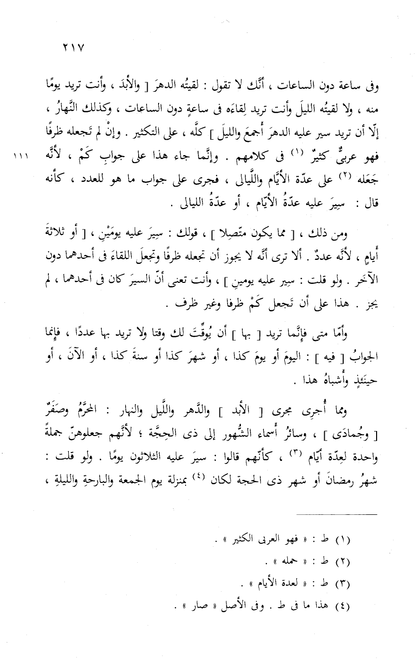 وفى ساعة دون الساعات، أنَّك لا تقول: لقيتُه الدهرَ " والأبدَ، وأنت تريد يوماً منه، ولا لقيته الليل وأنت تريد لقاءهفي ساعةٍ دون الساعات، وكذلك النَّهارُ، إلاّ أن تريد سير عليه الدهرَ أَجمعَ والليلَ " كلَّه، على التكثير. وإنْ لم تَجعله ظرفاً فهو عربىٌّ كثيرٌ فى كلامهم. وإنَّما جاء هذا على جوابِ كَمْ، لأنَّه جَعَله على عدّة الأيَّام واللَّيالى، فجرى على جواب ما هو للعدد، كأنه قال: سِيرَ عليه عدّةُ الأيّام، أو عدّةُ الليالى.