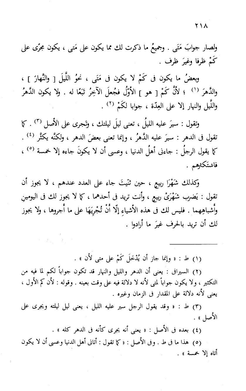 وبعضُ ما يكون فى كَمْ لا يكون فى مَتَى، نحوُ اللَّيلَ " والنَّهارَ " والدَّهرَ؛ لأنَّ كَمْ " هو " الأوّلُ فجُعلَ الأخِرُ تَبَعاً له. ولا يكون الدَّهرُ واللَّيل والنهار إلا على العِدّة، جوابا لكَمْ.