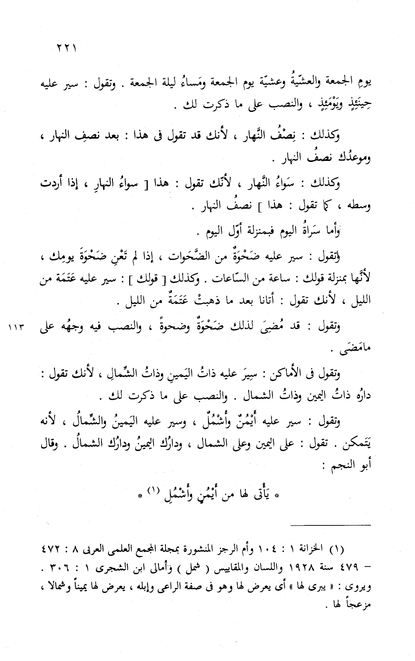 وتقول: سير عليه ضَحْوَةٌ من الضَّحَوات، إذا لم تَعْنِ ضَحْوةَ يومِك، لأنَّها بمنزلة قولك: ساعة من الّساعات. وكذلك قولك: سير عليه عَتَمَة من الليل، لأنك تقول: أتانا بعد ما ذهبتْ عَتَمَةٌ من الليل.