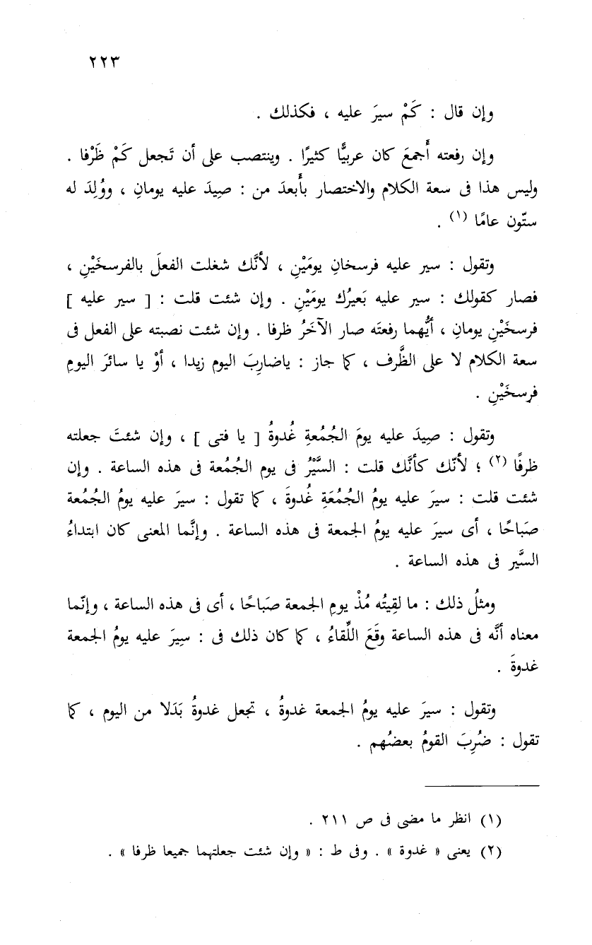 وتقول: صِيدَ عليه يومَ الجُمُعةِ غُدوةُ يا فتى، وإن شئتَ جعلته ظرفاً؛ لأنّك كأنَّك قلت: السَّيْرُ فى يوم الجُمُعة فى هذه الساعة. وإن شئت قلت: سير عليه الجُمُعَةِ غُدوةَ، كما تقول: سيرَ عليه يومُ الجُمُعة صَباحاً، أى سيرَ عليه يومُ الجمعة فى هذه الساعة. وإنَّما المعنى كان ابتداءُ السَّير فى هذه الساعة.