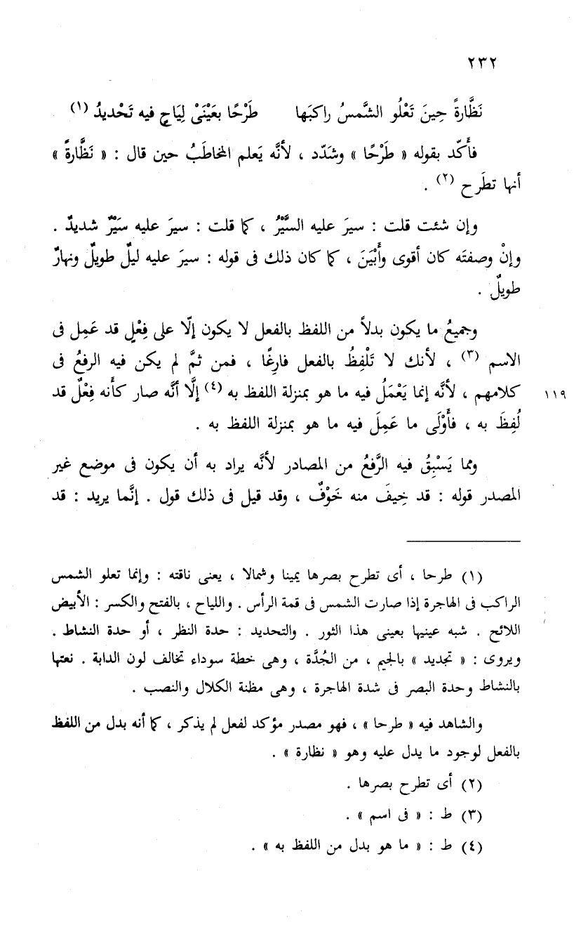 وجميعُ ما يكون بدلاً من اللفظ بالفعل لا يكون إلاّ على فِعلٍ قد عَمِل فى الاسم، لأنك لا تَلْفِظُ بالفعل فارِغاً، فمن ثمَّ لم يكن فيه الرفعُ فى كلامهم، لأنَّه إنما يَعمَلُ فيه ما هو بمنزلة اللفظ به إلاَّ أنَّه صار كأَنه فِعْلٌ قد لُفِظَ به، فأَوْلَى ما عَمِلَ فيه ما هو بمنزلة اللفظ به.
