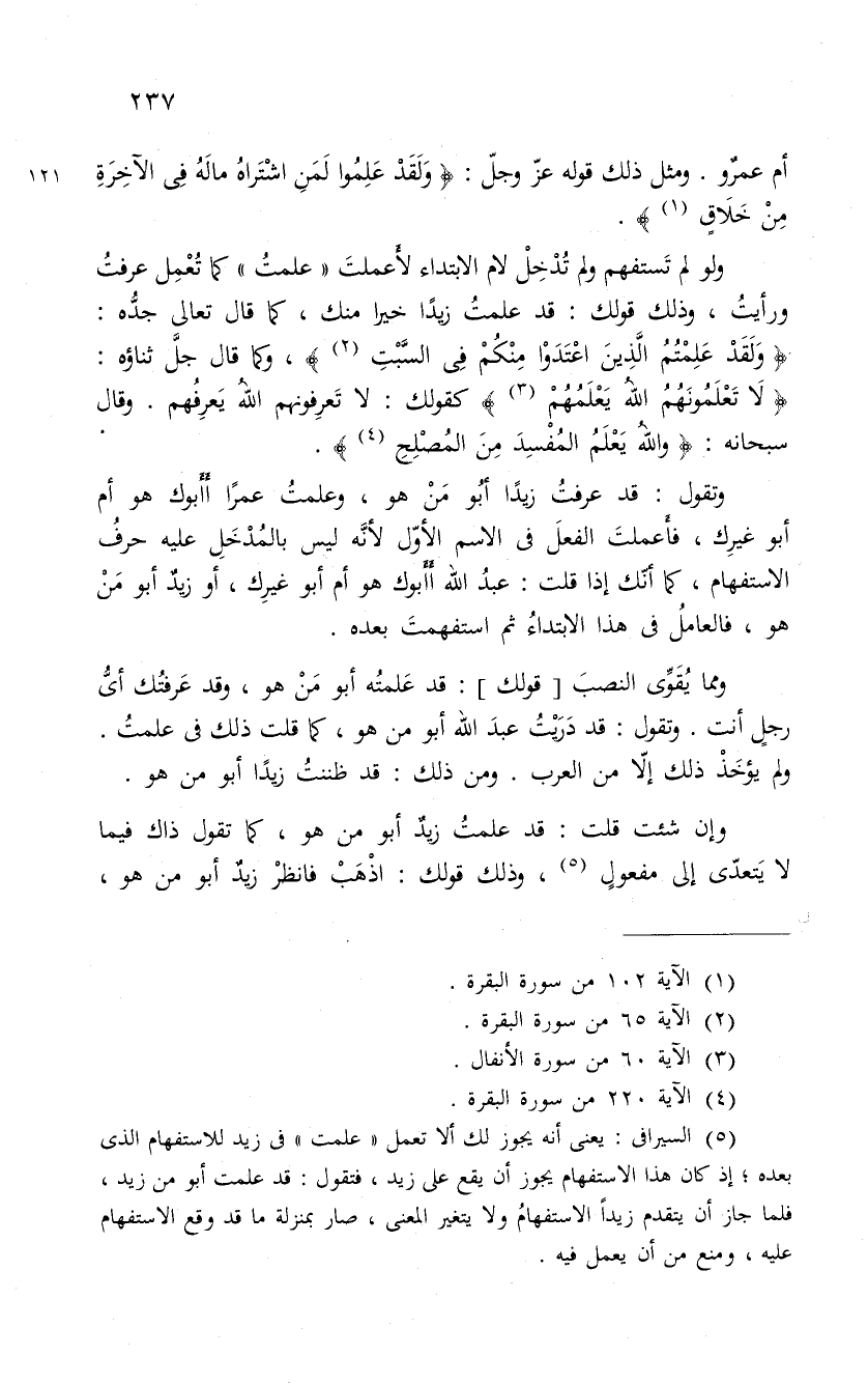 ومما يُقَوَّى النصبَ قولك: قد عَلمتُه أبو مَنْ هو، وقد عَرفتُك أىُّ رجلٍ أنت. وتقول: قد دَرَيْتُ عبدَ الله أبو من هو، كما قلت ذلك فى علمتُ. ولم يؤخَذْ ذلك إلاّ من العرب. ومن ذلك: قد ظننتُ زيداً أبو من هو.