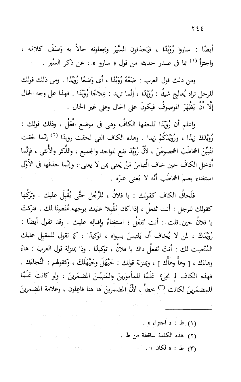واعلم أن رُوَيْداً تَلحقها الكافُ وهى فى موضع افعل، وذلك كقولك: رويدك زيداً، ورويد كم زيدا. وهذه الكاف التى لحقت رويداً إنّما لحقت لتُبيَّنَ المخاطَبَ المخصوصَ، لأنّ رُوَيْدَ تقع للواحد والجميع، والذَّكر والأُنثى، فإِنَّما أَدخل الكافَ حين خاف الْتباسَ مَنْ يَعنى بمن لا يعنى، وإنَّما حذفَها فى الأوَّل استغناء بعلم المخاطبَ أنّه لا يَعنى غيرَه.