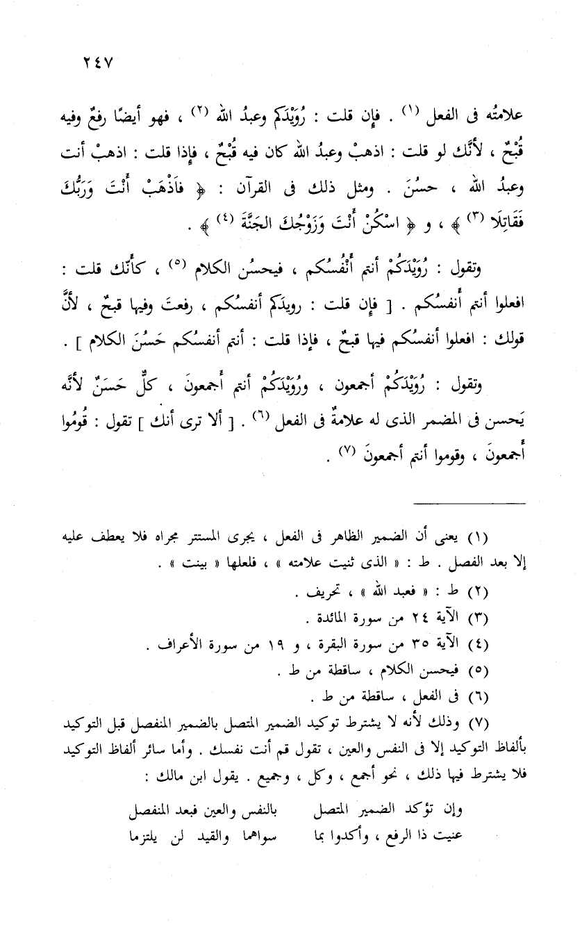 علامتُه فى الفعل. فإِن قلت: رُوَيْدَكم وعبدُ الله، فهو أيضاً رفعٌ وفيه قُبْحٌ، لأنَّك لو قلت: اذهبْ وعبدُ الله كان فيه قُبحٌ، فإِذا قلت: اذهبْ أنت وعبدُ الله، حسُنَ. ومثل ذلك فى القرآن: " فاَذْهَبْ أَنْتَ وَرَبُّكَ فَقٌَاتِلاَ "، و " اسكن أنت وزوجك الجنة ".