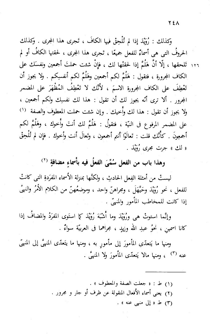 وكذلك: رُوَيْدَ إذا لم تُلْحِقْ فيها الكافَ، تجري هذا المجرى. وكذلك الحروف التي هي أسماءٌ للفعل جميعاً، تَجرى هذا المجرى، لحقتها الكافُ أو لم تَلحقها، إلاّ أنَّ هَلُمَّ إذا لحقتْها لك، فإِنْ شئت حملتَ أجمعين ونفسَك على الكاف المجرورة، فتقول: هَلُمَّ لكم أجمعين وهَلُمَّ لكم أنفسِكم. ولا يجوز أن تَعْطِفَ على الكاف المجرورة الاسمَ، لأنَّك لا تَعْطِفُ المُظْهَرَ على المضمر المجرور. ألا ترى أنّه يجوز لك أن تقول: هذا لك نفسِك ولكم أجمعين، ولا يجوز أن تقول: هذا لك وأَخيك. وإن شئت حملت المعطوف والصفة على المضمر المرفوع فى النيّة، فتقولُ: هَلُمَّ لك أنتَ وأَخوك، وهَلُمَّ لكم أجمعونَ. كأَنَّك قلت: تَعالَوْا أنتم أجمعون، وتَعالَ أنت وأخوك. فإِن لم تُلْحِقْ لك جرت مجرى رويد.