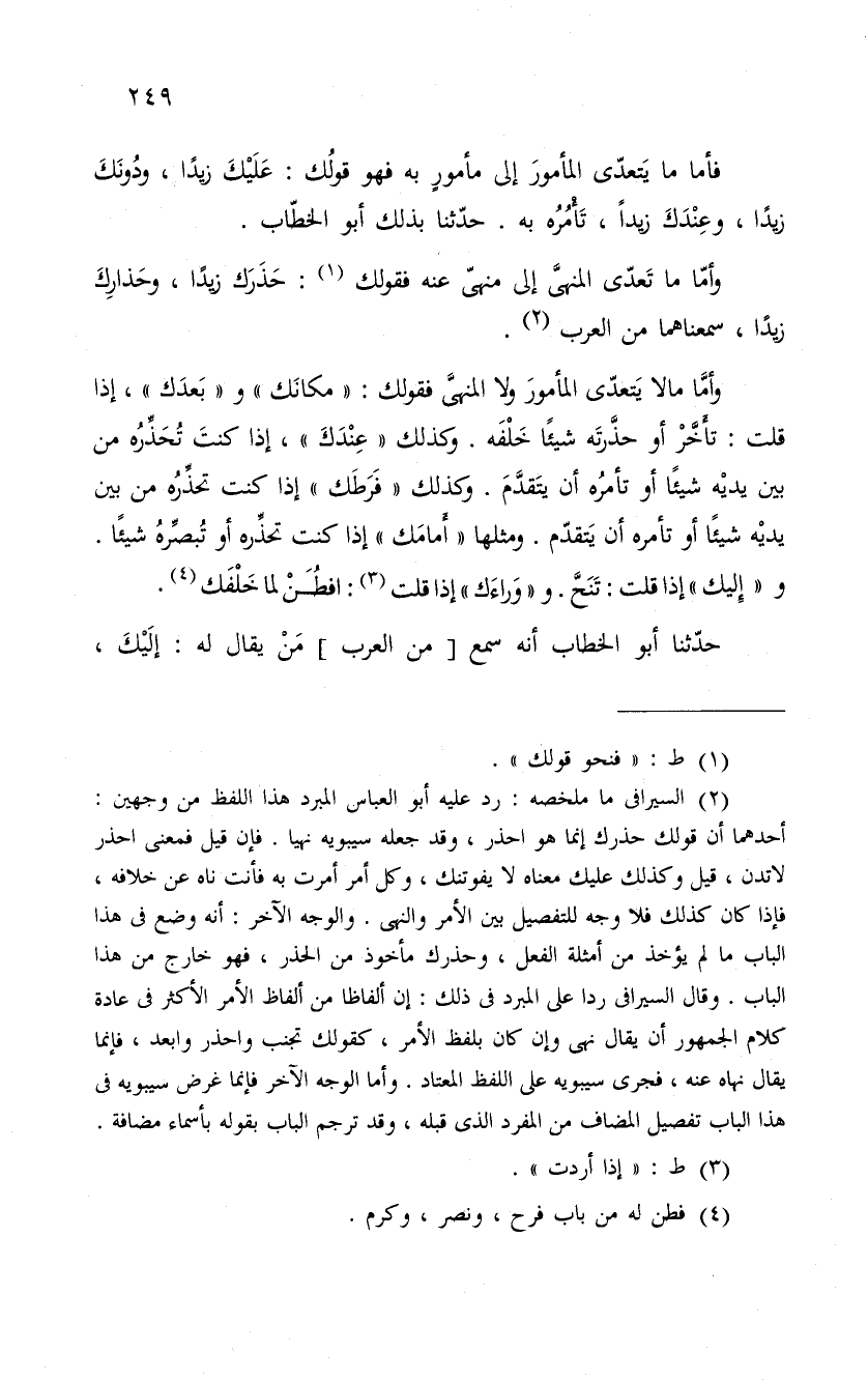 وأما ما لا يَتعدّى المأمورَ ولا المنهىَّ فقولك: مكانَك وبَعدَك، إذا قلت: تأَخَّرْ أو حذَّرتَه شيئاً خَلفَه. كذلك عِنْدَكَ، إذا كنتَ تُحَذَّرُه من بين يديْه شيئاً أو تأمره أن يَتَقدّمَ. وكذلك فَرَطَك إذا كنت تحذره من بين يديه شيئا أو تأمره أن يَتقدّم. ومثلها أَمامك إذا كنت تحذَّره أو تُبصَّرهُ شيئاً. وإليك إذا قلت: تَنَحَّ. ووَراءَك إذا قلت: افطُنْ لما خلفك.