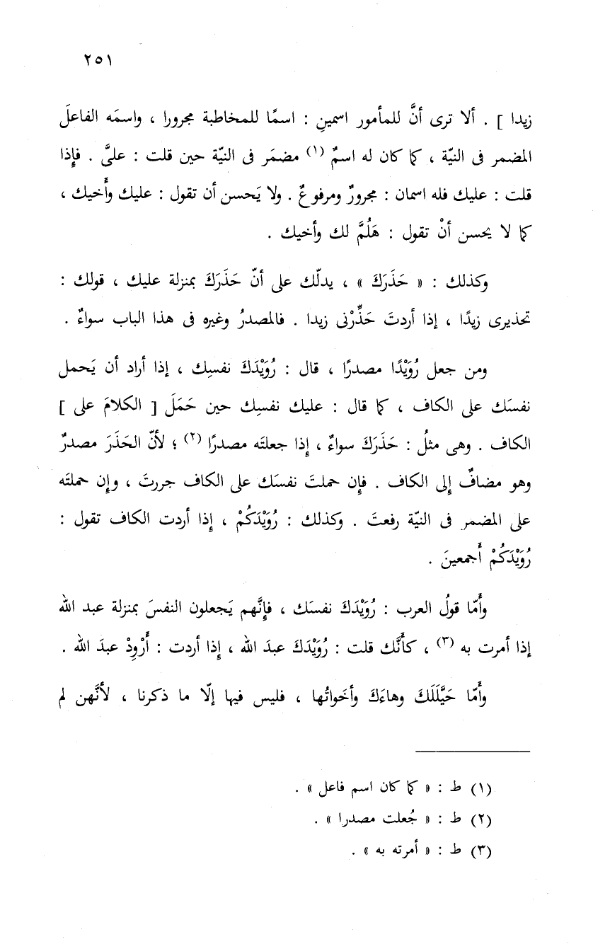 ومن جعل رُوَيْداً مصدراً، قال: رُوَيْدَكَ نفسِك، إذا أراد أن يَحمل نفسَك على الكاف، كما قال: عليك نفسِك حين حَمَلَ الكلامَ على الكاف. وهى مثلُ: حَذَرَكَ سواءٌ، إذا جعلتَه مصدراً؛ لأنّ الحَذَرَ مصدرٌ وهو مضافٌ إلى الكاف. فإِن حملتَ نفسَك على الكاف جررتَ، وإِن حملتَه على المضمر فى النيّة رفعتَ. وكذلك: رُوَيْدَكُمْ، إِذا أردت الكاف تقول: رُوَيْدَكُم أَجمعينَ.